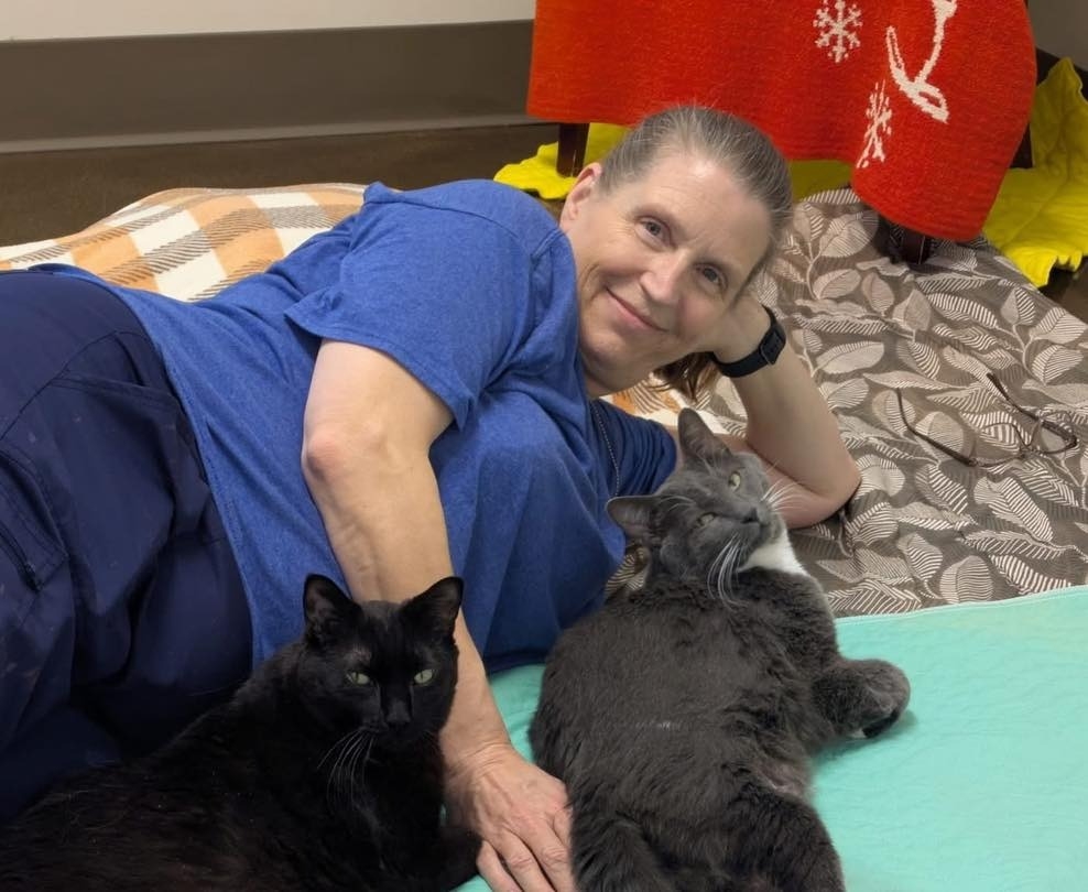 I’ve known Kelly and Guapo for as long as I’ve been here, which was four years in March of 2025. I’ve taken care of them for about three years of that, beginning at the shelter before Meow Manor was built. When I moved over to MM, I took them with me out of deep love and admiration of them.